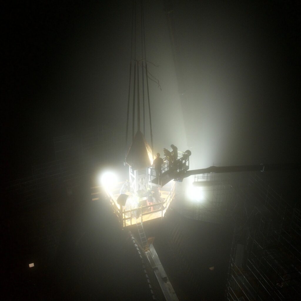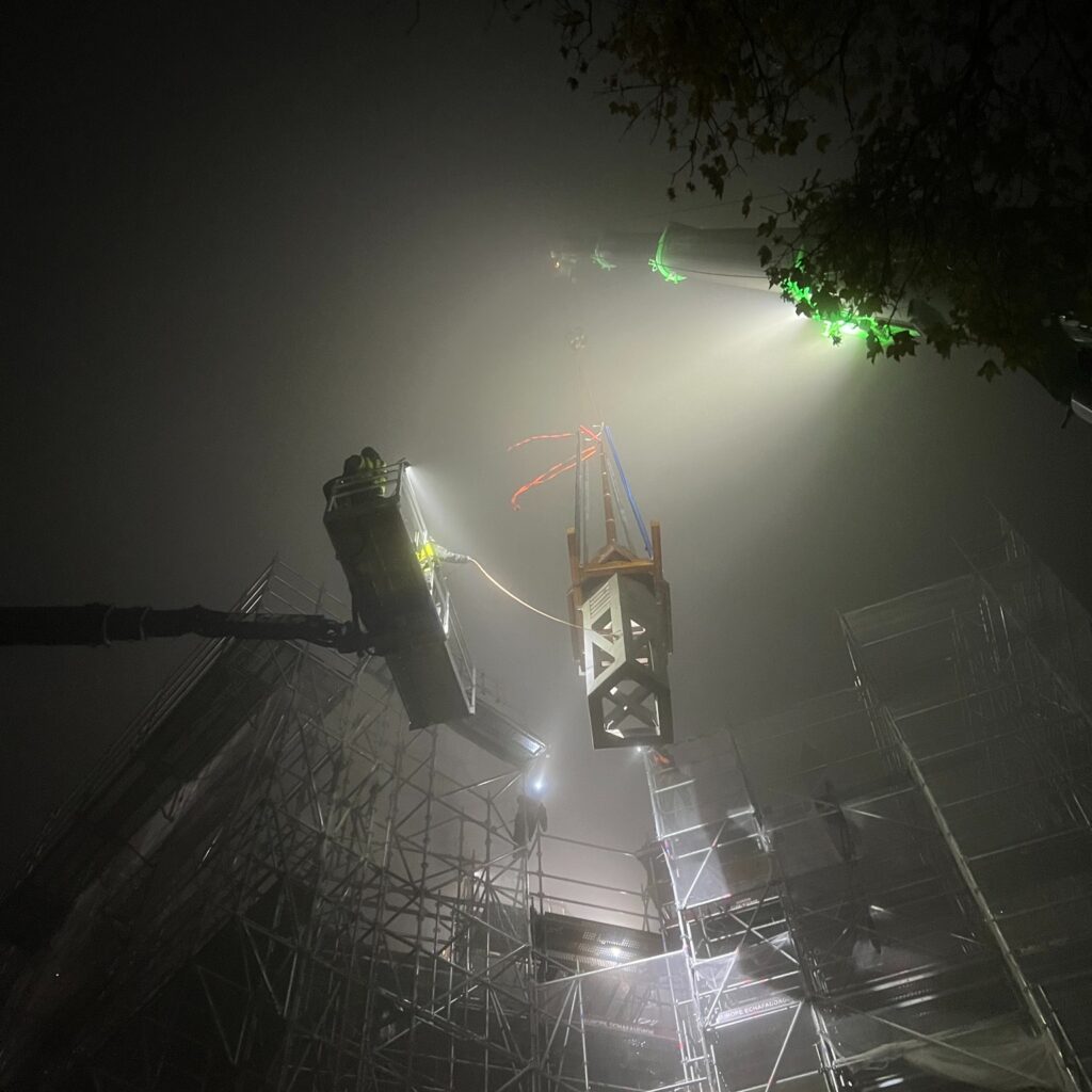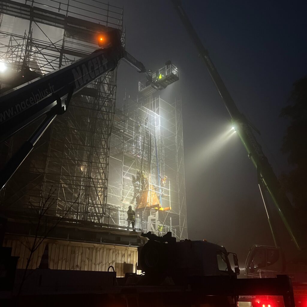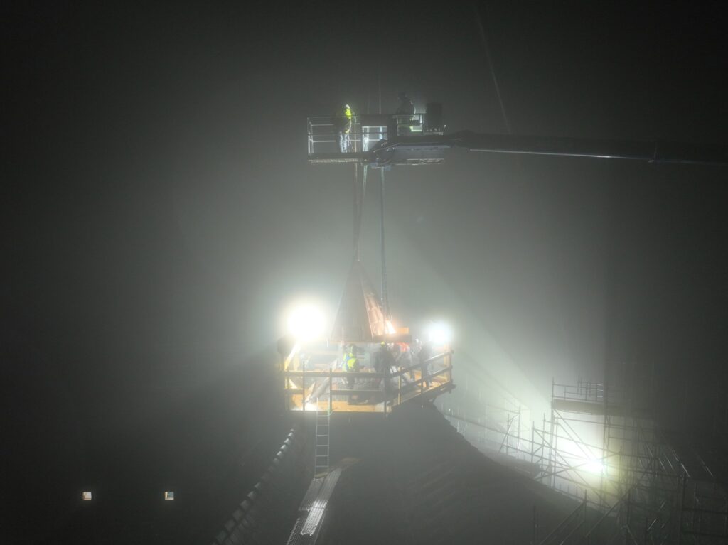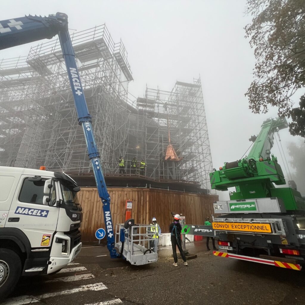 Le lanternon a été déposé avec une grue le mercredi 24 septembre au soir après la fermeture du monument et fixé au sommet de la toiture du Bastion en toile. Un moment symbolique et remplissant de fierté l’équipe du château et toutes les entreprises.